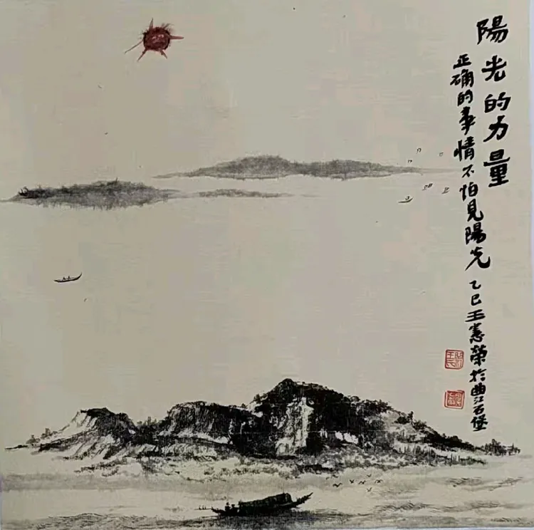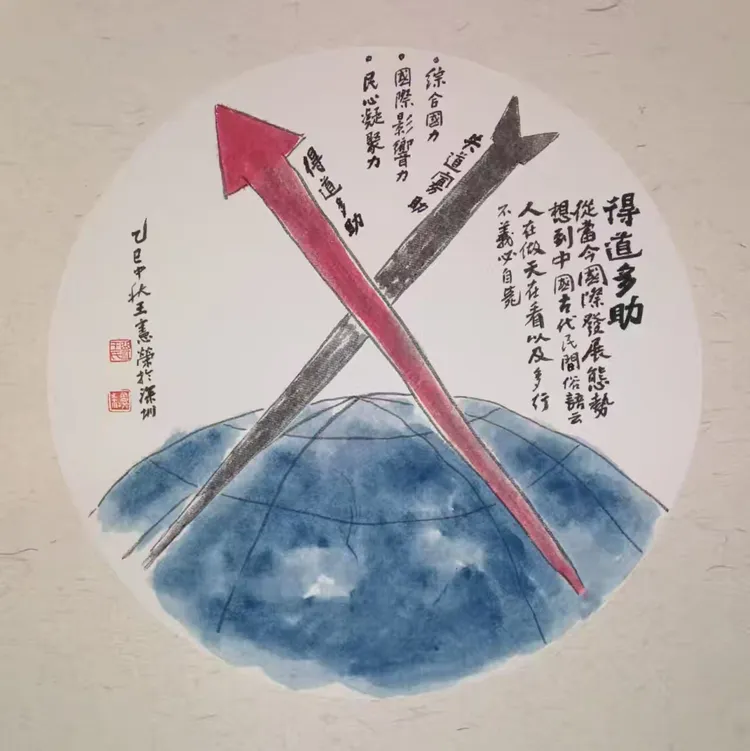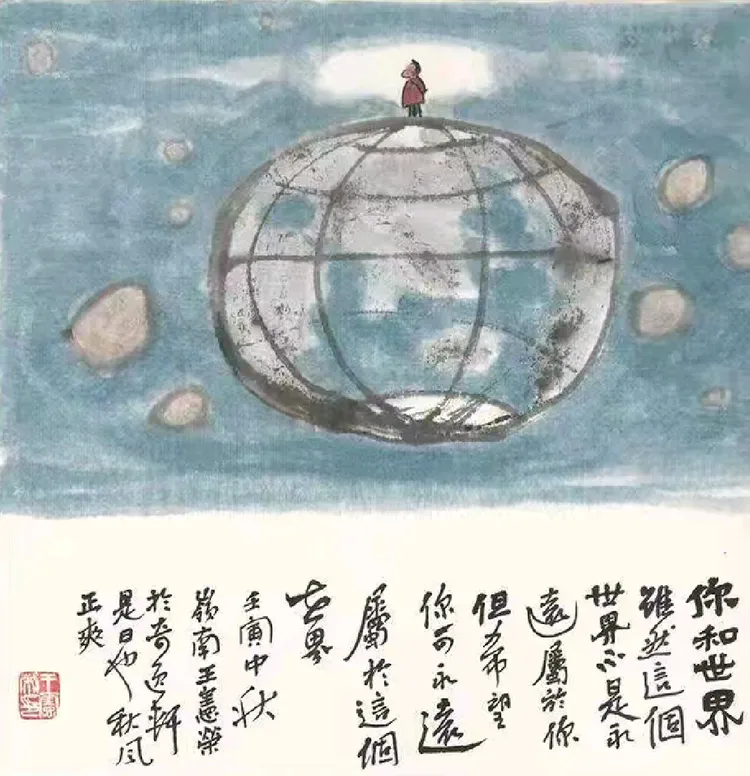 王宪荣哲理水墨《你和世界》,以简约笔墨绘就宏大哲思:渺小的身影立于地球之巅,水墨晕染间,道尽“你与世界”的共生关系。题跋温暖而深刻,以画载道,传递对个体价值与宇宙格局的辩证思考,是其以艺化人、启迪人心的经典之作。