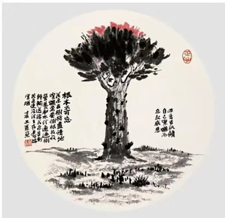 题字“根本不可忘”四字,直抵作品核心:树高千尺不忘根,人行万里不忘本。这幅作品,主要想表达生命之根、文化之根、祖国之根不可忘的理念、意识。先生将深刻的人生哲理、家国情怀,融入极简的水墨意象,让传统水墨画跳出了闲情逸致的窠臼,成为启迪人心、传递正能量的载体。