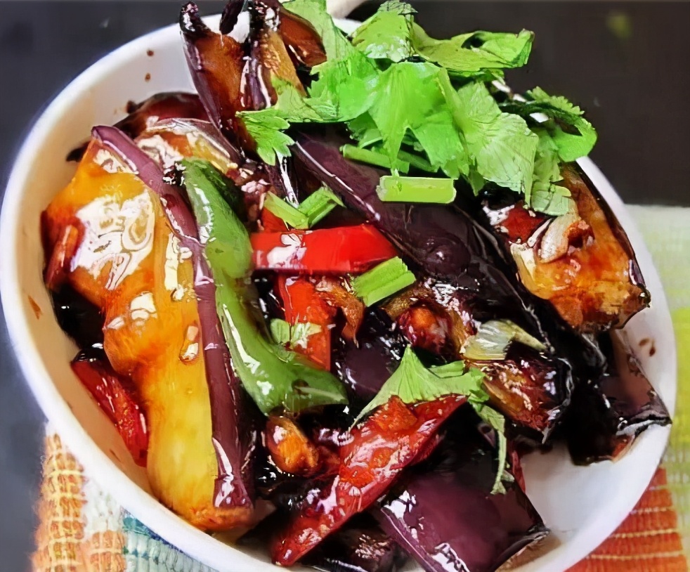 2.锅中油烧热,放入挤干水分的茄子炸制茄子变软捞出沥油,原锅留少许底油爆香葱姜,倒入青红椒翻炒均匀,倒入炸好的茄子翻炒,倒入调好的料汁翻炒均匀,淋入少许香油,翻炒均匀盛盘时撒香菜即好。