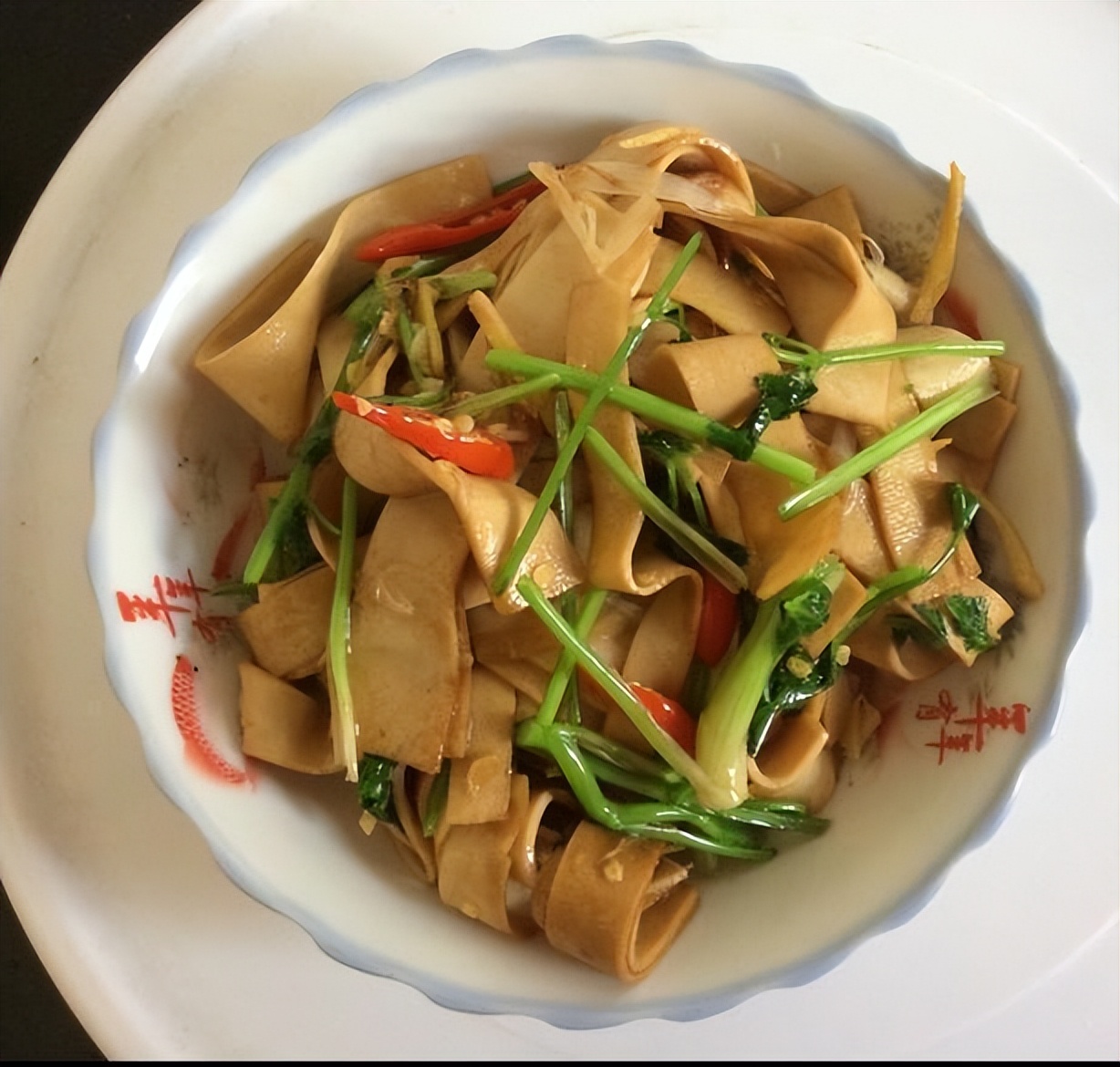 做法1.豆腐皮切成大约7厘米长、0.5厘米宽的粗条,入沸水中汆烫1~2分钟,捞出沥干水分;起炒锅,热锅凉油爆香葱姜丝;