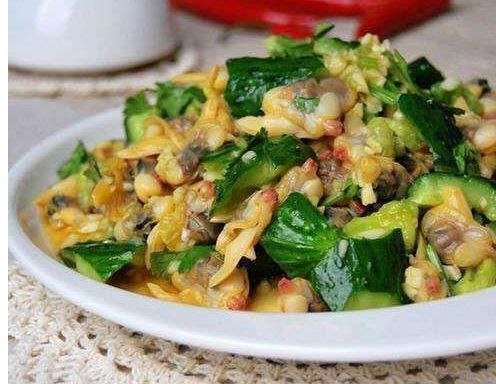 食材:嫩黄瓜、大蒜、沙蛤蜊、盐、糖、陈醋、凉拌酱油、香油