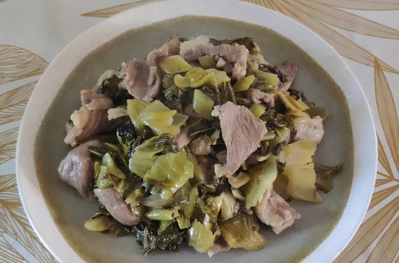 5、放入咸菜爆炒,炒到六成熟白糖少许,咸菜汁一汤勺,可适量烹清水,让咸菜香气溢出。翻炒两三分钟,即可装盘出锅