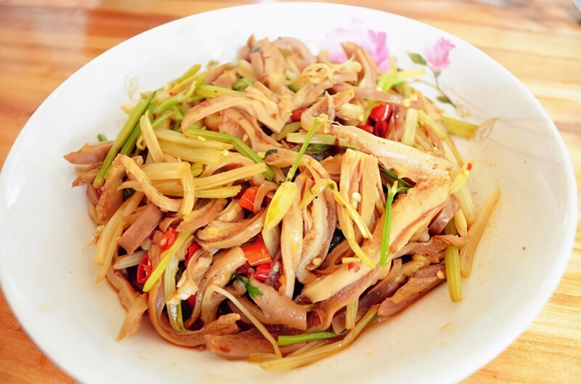 做法:1.要将猪肚上的污秽和臊味除去,把里面翻出来用盐腌一下加入,面粉把猪肚抓一遍,放在清水里洗去污秽粘液,然后放进开水锅中煮至白脐结皮取出,再放在冷水中泡一下,用刀刮去白脐上的秽物。用清水冲洗干净后下锅煮至熟烂,捞出切丝。