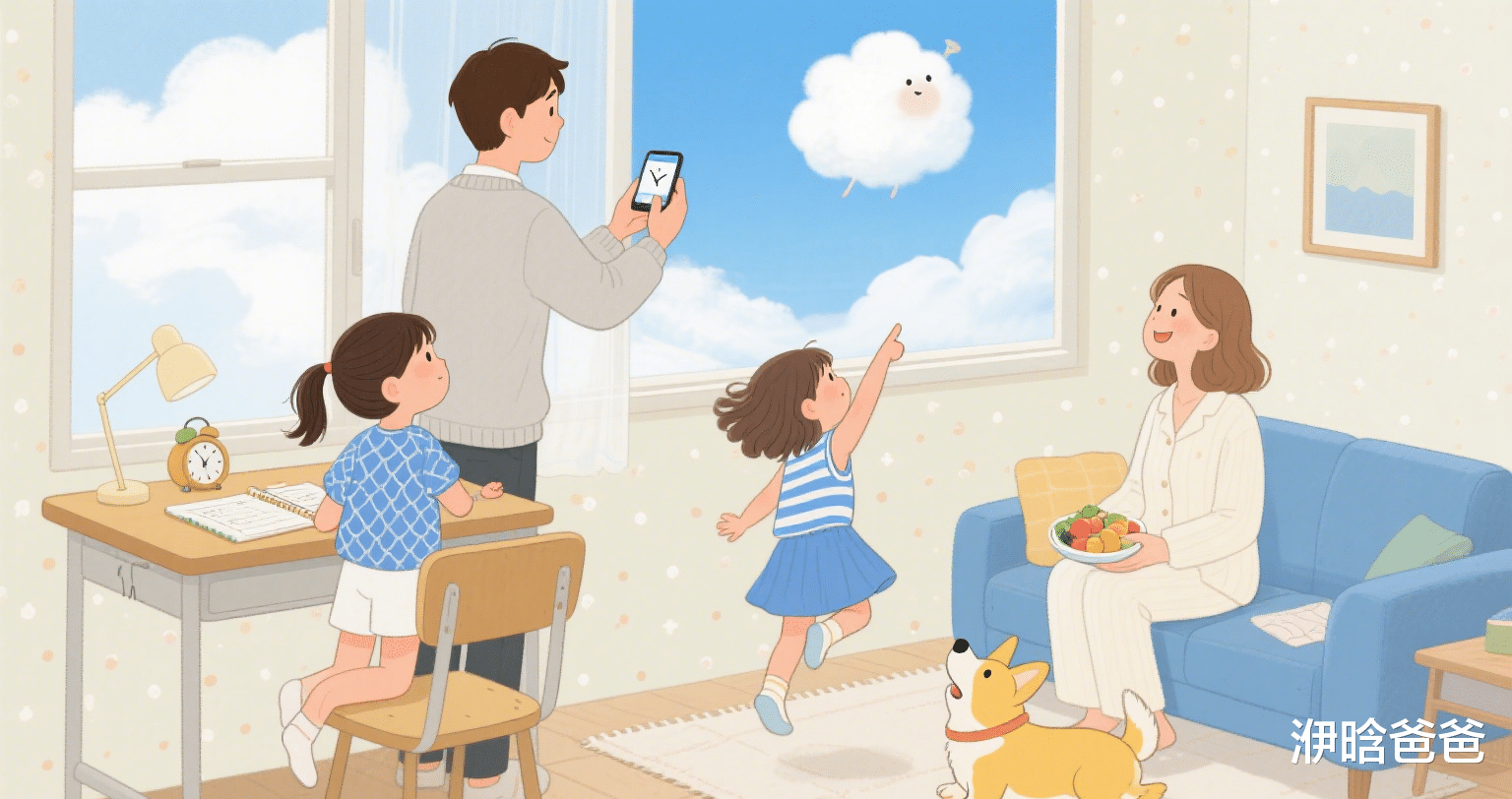 昨天姐姐写作业的时候,我提前设置了个闹钟,时间一到,我就说:“你看那个云现在像什么形状?”