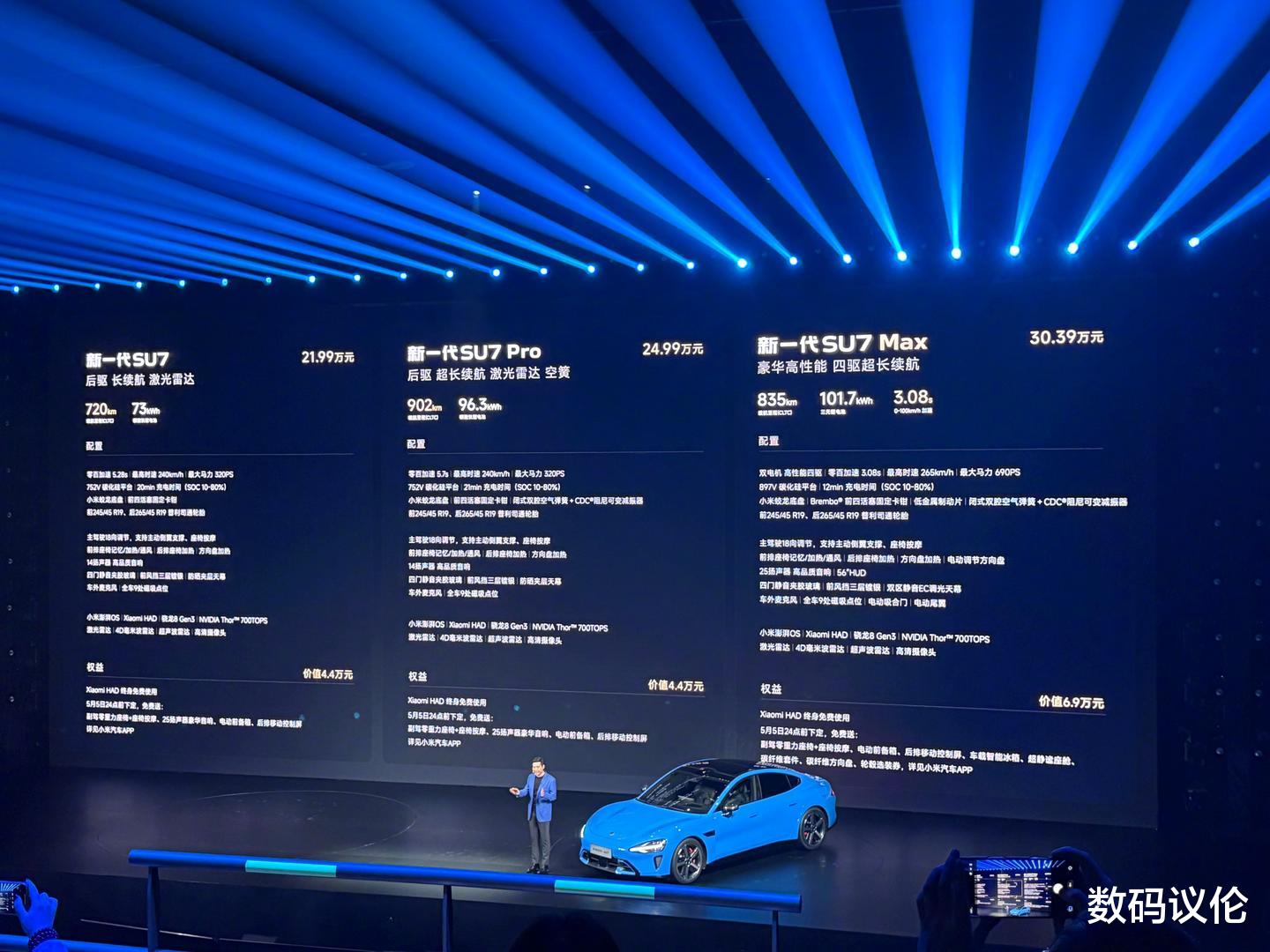 Pro版249,900元、Max版303,900元,Max首销除了以上的权益,还加了压缩机冰箱+超精密座舱+碳纤维后视镜+迎宾踏板+运动方向盘,雷总说不喜欢碳纤维也可以不送。