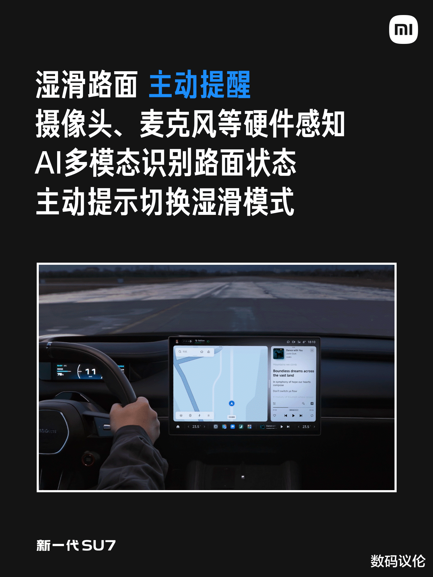 全新防滑协同控制系统,在湿滑路面全油门起步,车轮打滑量能降低40%,轮端滑动仅需0.35秒,还支持智能识别路面状况,借助语音+视觉大模型实时识别,做到主动提醒车主打开湿滑模式。