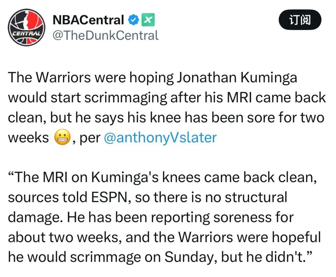 据随队记者AnthonyVSlater报道,库明加核磁共振结果正常,并无结构性损伤,