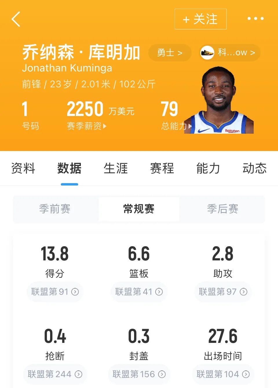 总之,要是将他视作为一名普通首发球员,那库明加绰绰有余,能及格;🌀但要被当成库里之后,勇士未来的建队核心要求他,那库明加明显未及预期。