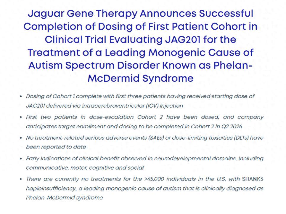 其用于治疗由SHANK3基因缺陷引起的Phelan-McDermid综合征(PMS)的AAV基因疗法JAG201,在首次人体临床试验中已完成首批5名患儿给药,且无一例严重不良事件发生。