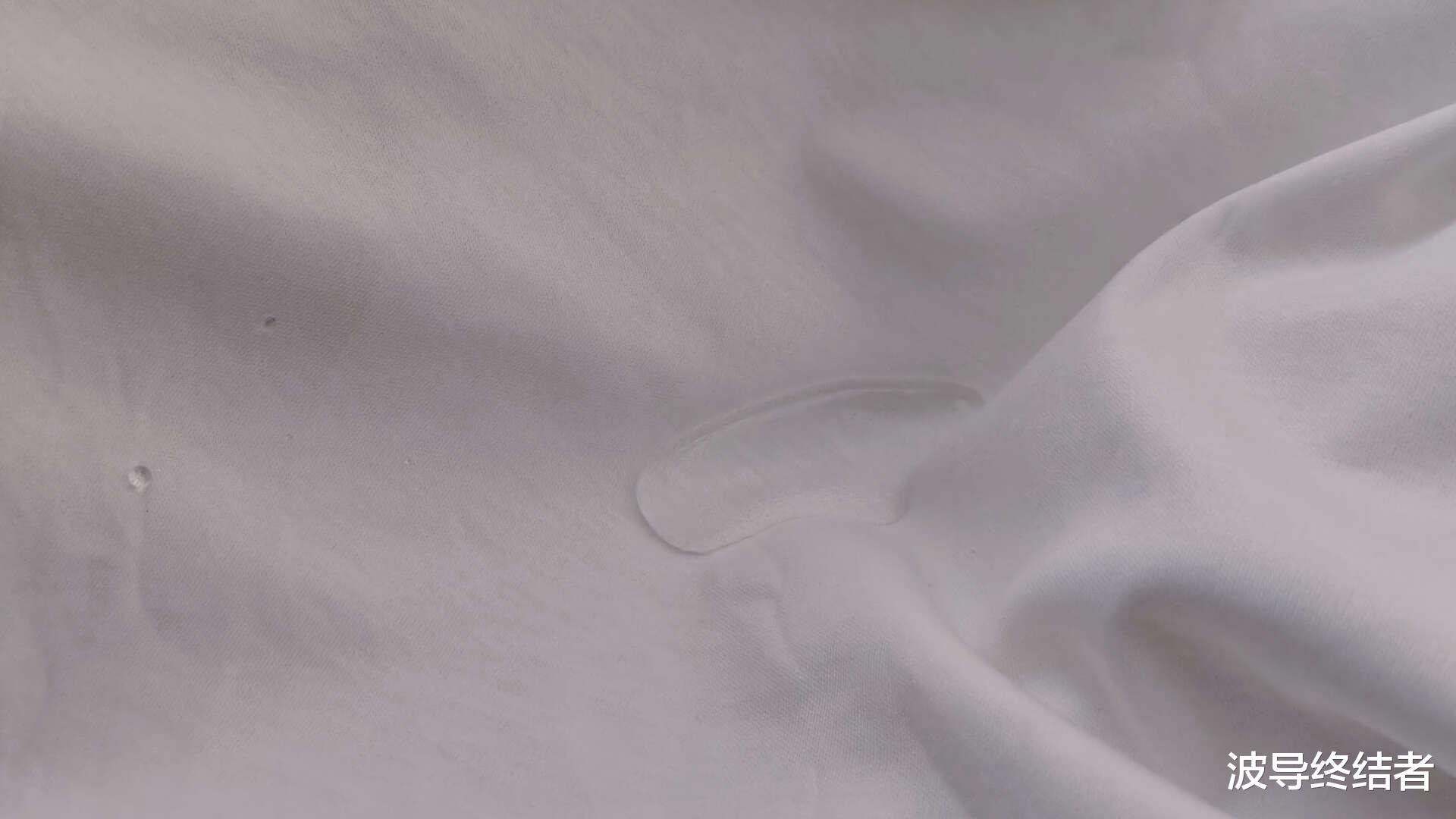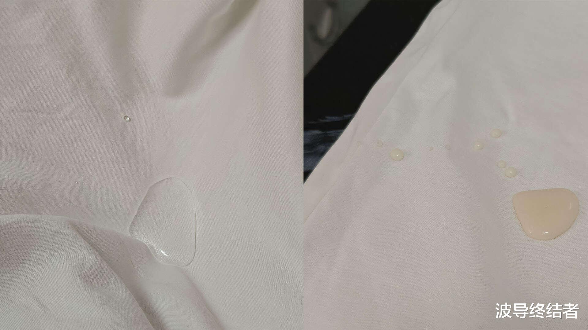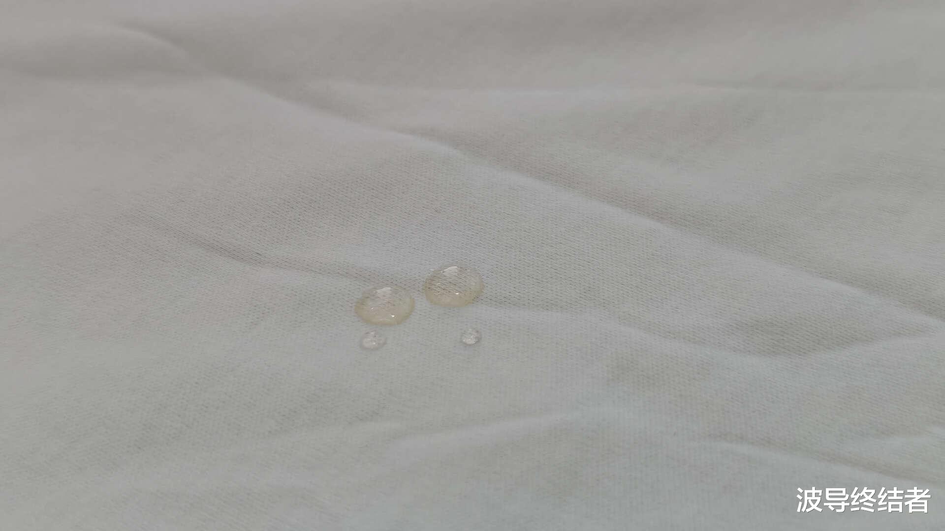 另一点防的是防油,平常生活中,难免会不小心沾到点油渍在衣服上,特别是家里有小朋友,更容易受波及。弄点油洒在衣服上,可以看到油也凝成了一个接近圆形的水珠,没有被吸收进衣服纤维里,拿个纸巾擦掉,就跟新的一样了。