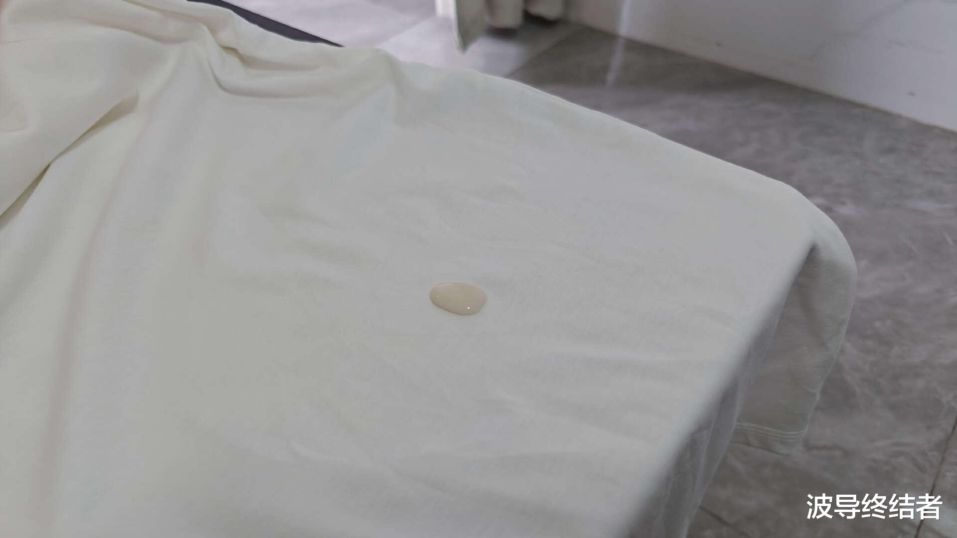 那如果是其他污渍呢?家里小朋友最近很爱喝奶茶,外面买的不知道有什么添加剂,所以我都是在家里自己用牛奶加自己泡的茶来做。不小心洒在衣服上,这款六防T恤能直接将污渍排走,平放可以看到奶茶没有浸透衣服,而是形成一个大水珠,擦掉即可。