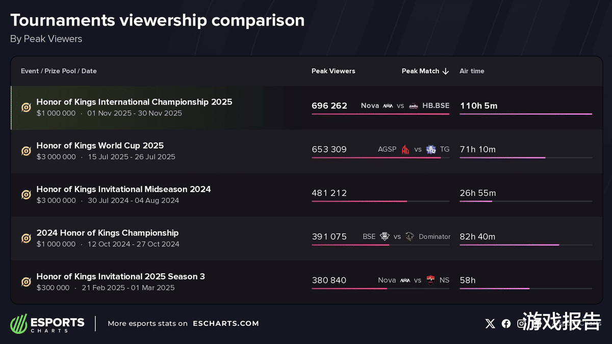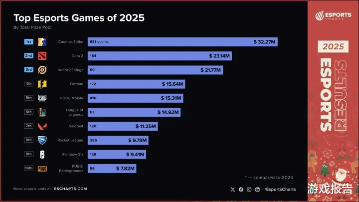 根据第三方数据机构 EsportsCharts 的统计,2025 年《王者荣耀》全球赛事总奖金池达到 2177 万美元,在全球电竞项目中位列第三,是移动电竞领域奖金规模最大的赛事生态 。