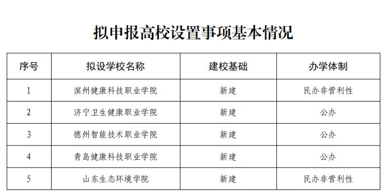 拟新设高校分别为滨州健康科技职业学院、济宁卫生健康职业学院、德州智能技术职业学院、青岛健康科技职业学院和山东生态环境学院。其中,3所为公办,2所为民办。