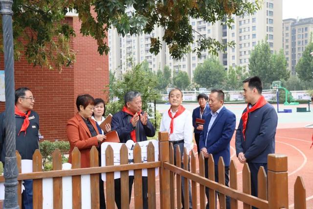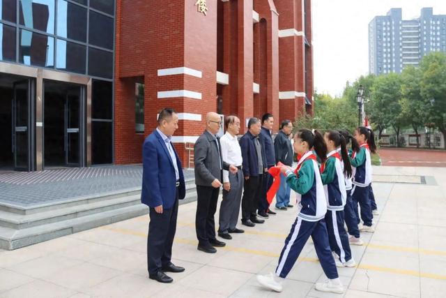在学校希望广场,少先队员们向领导敬献红领巾。