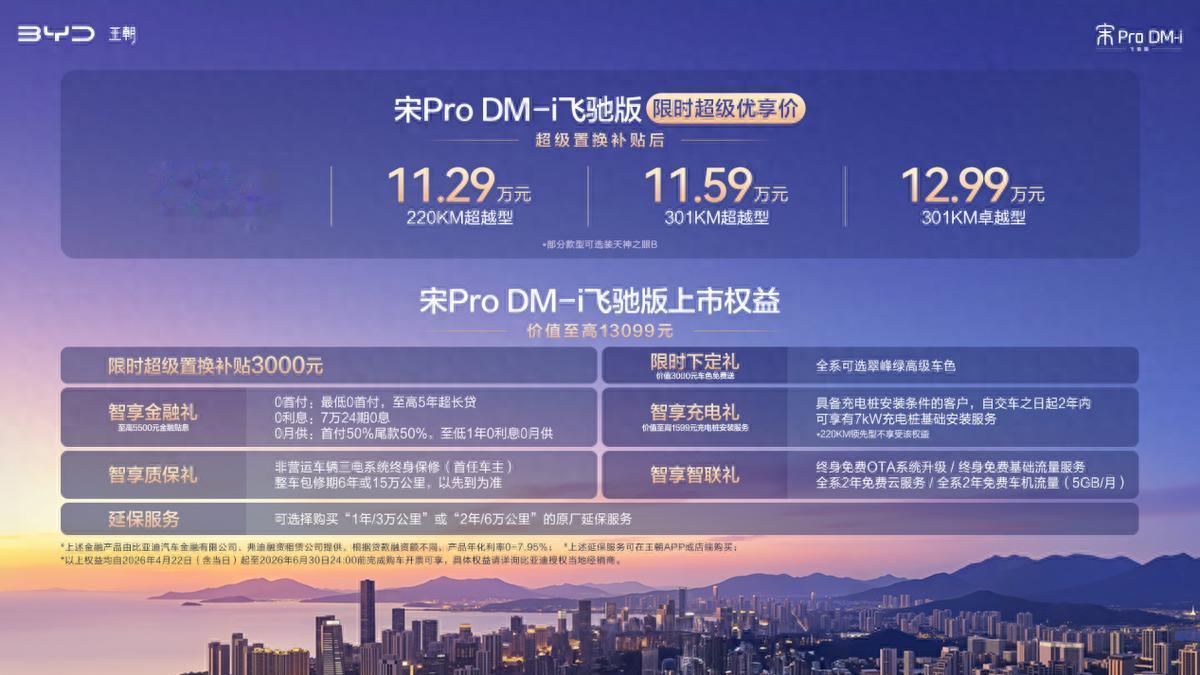4月22日,比亚迪宋Pro DM-i飞驰版正式上市,超级优享价9.99万元——12.99万元。新车 CLTC 纯电续航提升至 301km,在续航、安全、舒适与智能等方面实现全维度越级进阶,为家庭用户带来更高品质出行体验,重新树立 A 级插混 SUV 新标杆。