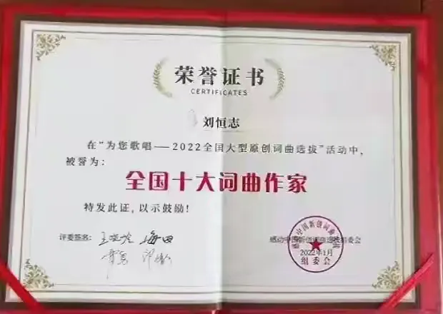 因创作海军新时代军歌《走向深蓝》而成为“走向深蓝”一词发明人,在《感动中国》人民喜爱的艺术家全国听(观)众群众性评选中,凭借《走向深蓝》(霍勇演唱)、《海军蓝》《大海誓言》(吕继宏演唱)、《领航新时代》(刘丹丽演唱)、《撸起袖子加油干》(何沐阳曲、周深等演唱)、《农民父兄》(春雷演唱)、《我们是英雄护航兵》《奔向海洋-海军士官学校校歌》、《我们一同走过从前》(康澎曲 董文华演唱)、《战士·界碑·祖国》(于乃久演唱)、《伴你人间天地情》(杜克曲 白雪演唱)、《军旗情》(朱虹演唱)、《更多的时候》、《足迹》(楚兴元曲、杨洪基演唱)、《光照四季》(莎光曲 谭晶演唱)、《丽江酒歌》(许镜清曲、阎维文演唱)、粤韵歌曲《领航新时代》(刘恒志作词,陈仲琰、卢华作曲,叶幼琪演唱)、《启航》(万山红演唱)、《永远青春的中华魂》(戴玉强、黄华丽演唱)等,荣获“中国十大词曲作家”称号。