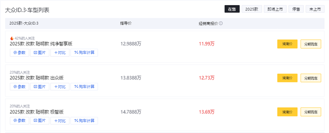 以2025款 改款车型为例,全系共有3个配置版本可供选择,官方指导价保持在12.9888-14.7888万元。而且大众ID.3为了进一步提升竞争力,和国产同级对手抗衡,入门版的裸车价跌至到11.99万元,考虑到大众出品的身份以及紧凑型车的定位,论起性价比,的确没有什么可挑剔的地方。