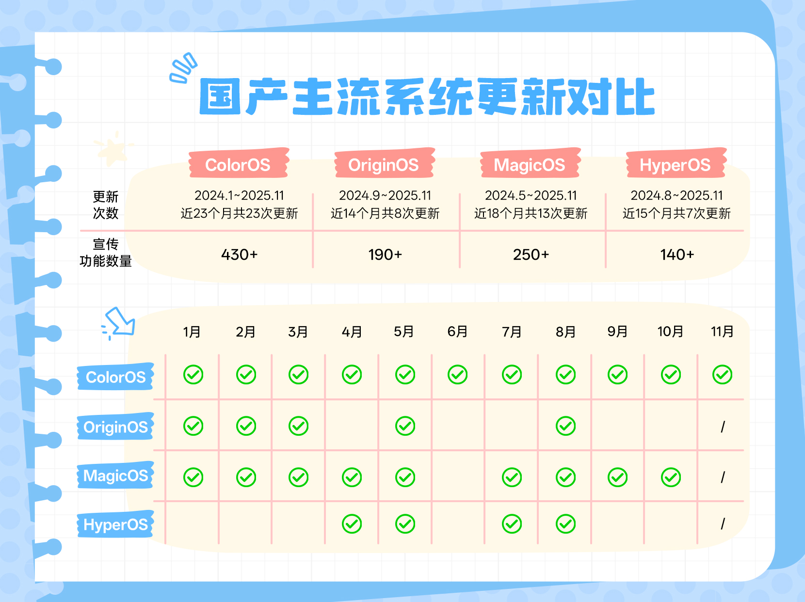 如果把系统更新当成一项长期工程,ColorOS 现在已经跑完了 23 圈长跑。自 2024 年 1 月起,ColorOS 做到了“月月不缺勤”的 OTA 频率,到 2025 年 11 月累计 23 次月更,新增功能超过 430 项,把很多品牌一年两三次的大版本更新,拆成了用户每月可感知的小步快跑。