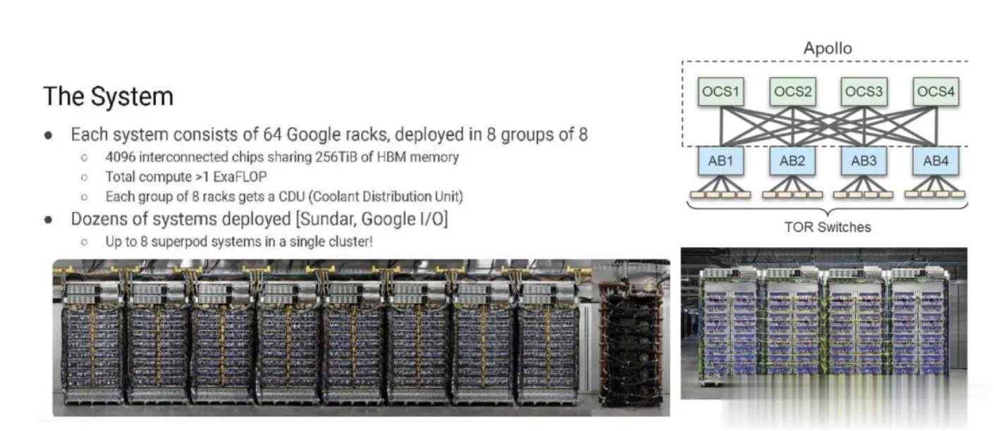 谷歌数据中心采用48台OCS光交换机互联9216颗TPU,网络宕机时间从2000小时延长至10万小时。