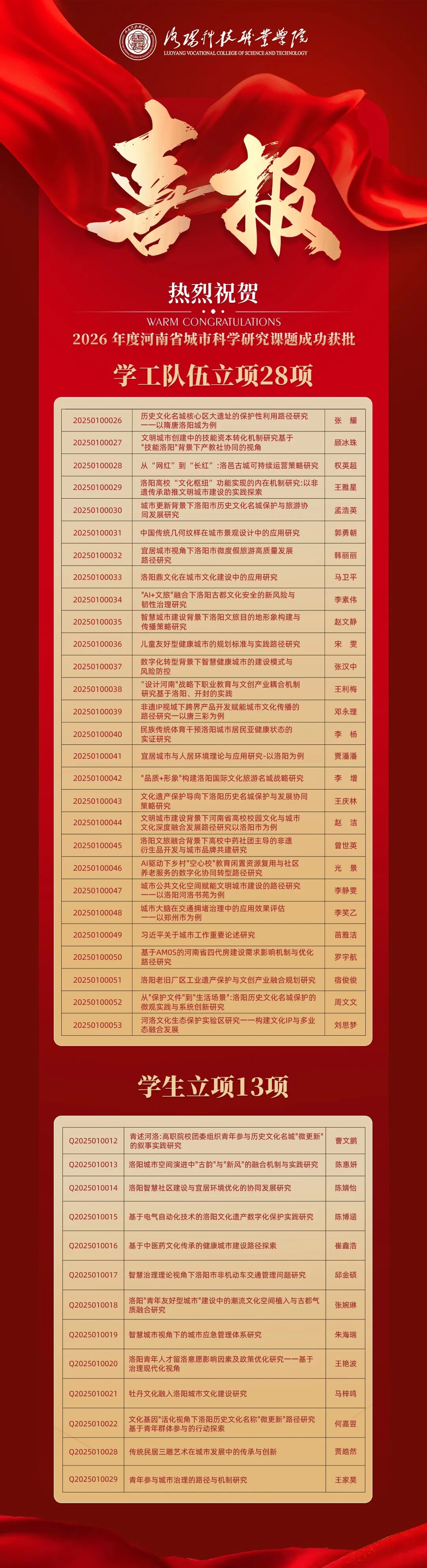 近日,2026年度河南省城市科学研究会课题立项结果公布,洛阳科技职业学院表现亮眼,共计获批立项41项。尤为引人注目的是,其中13项由学生担任课题主持人。这一成绩不仅展现了洛阳科技职业学院扎实的育人成效,更是学校长期坚持“以学生为中心”,深化科研育人模式探索的生动实践与丰硕成果。