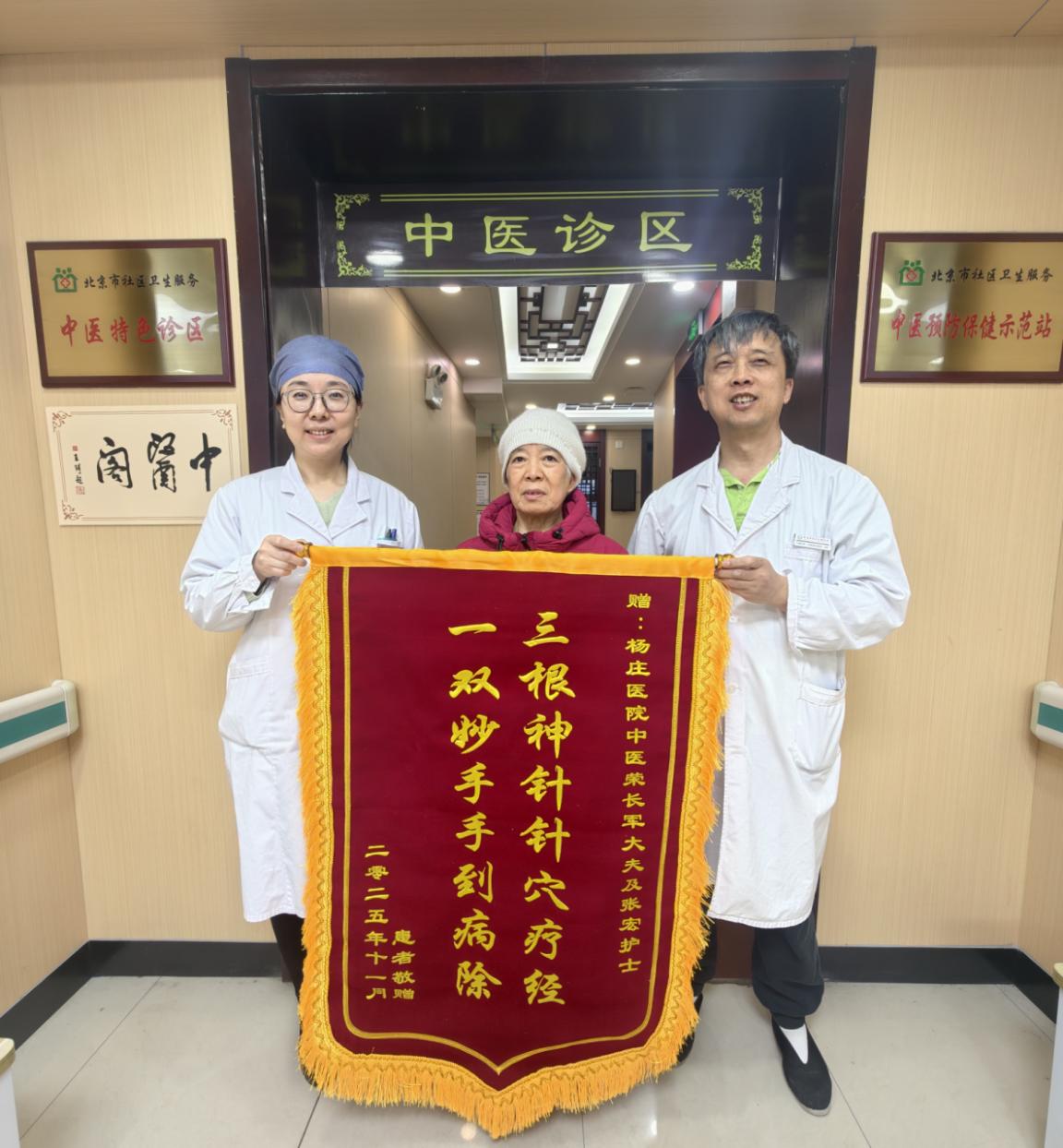 近日,患者李阿姨将一面印有“三根神针针穴疗经,一双妙手手到病除”烫金字样的锦旗送到杨庄社区卫生服务站中医科荣长军医师和张宏护士手中,再三道谢。这是科室近日来收到的第二面锦旗,鲜红锦旗上的字句,正是李阿姨对三次针灸解病痛的真切感慨。