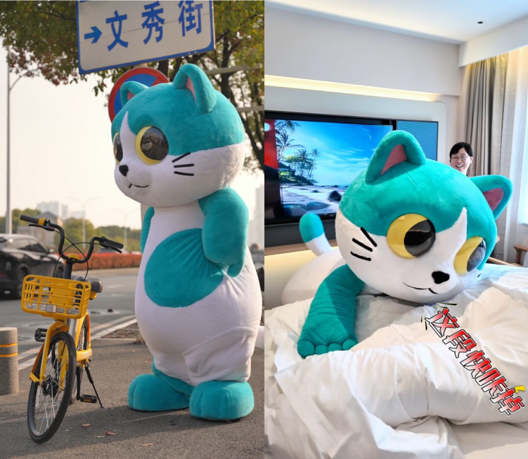 东呈集团于2023年推出中国酒店行业首个自主设计的超级动物IP“小青猫”,拥有ISTP人格设定,被赋予鲜明的活人感——巡游时想骑单车但腿短、帮铺床单却把自己卷进去、被电梯夹头后会“记仇”生气。