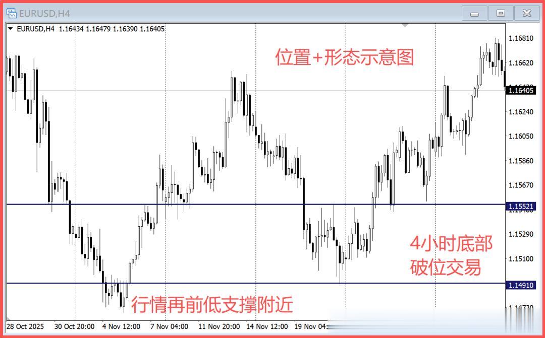 在这个位置,4小时级别形成了一个底部向上破位的形态,破位的价格是1.15521,之后行情大幅上涨。