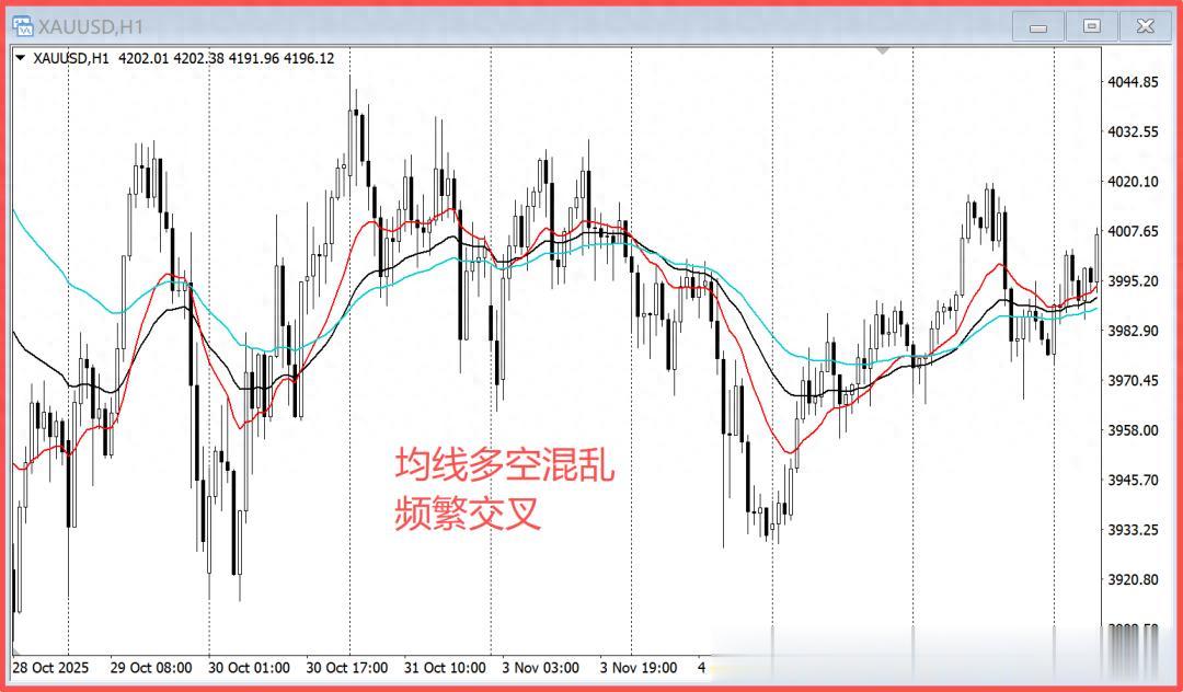 图中是黄金1小时级别的K线图,在整个近8个交易日的走势里,均线多空频繁交叉,方向混乱,高低点不明,很难找到清晰明确的开仓,止损,平仓点。