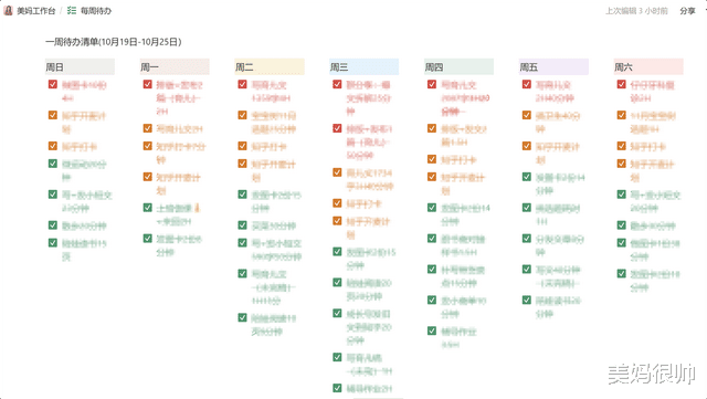 别说孩子,就连我自个儿,也正儿八经地写。喏,这是我的周待办,也是我的成功日记,每天干了啥事,有啥新成就,每件事耗时多少,都写得一清二楚。