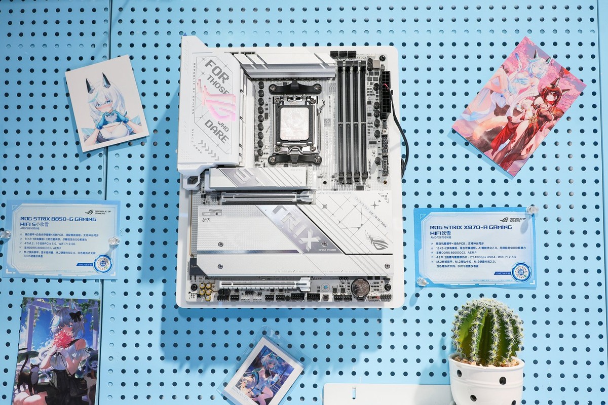 性能上,3个M.2接口(含1个PCIe 5.0)与PCIe 5.0 x16显卡插槽充分释放RTX50系显卡性能,WiFi 6E+2.5G网卡助力玩家畅享高速网络。现场同步展出的B850小吹雪主板同样吸睛,超大面积银白散热装甲搭配雪武战姬元素,支持DDR5 9066+(OC)内存与WiFi7网络,成为次元美学与硬核性能的完美结合体。