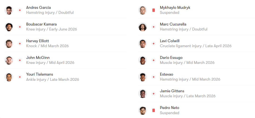 切尔西这边,核心前锋帕尔默虽能出战,但边锋内托因红牌停赛,左后卫库库雷利亚伤疑,攻防两端均有隐患。更致命的是球队纪律涣散,本赛季已吃到7张英超红牌,平均每3.25场就有一人被罚下,少打一人时场均仅得1.3分,凯塞多、恩佐等中场核心累计黄牌数居高不下,随时面临停赛风险,这将严重限制罗塞尼尔的战术调整空间。