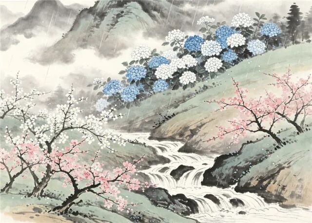 檵李桃花次第开,绣球朵朵雪山来。