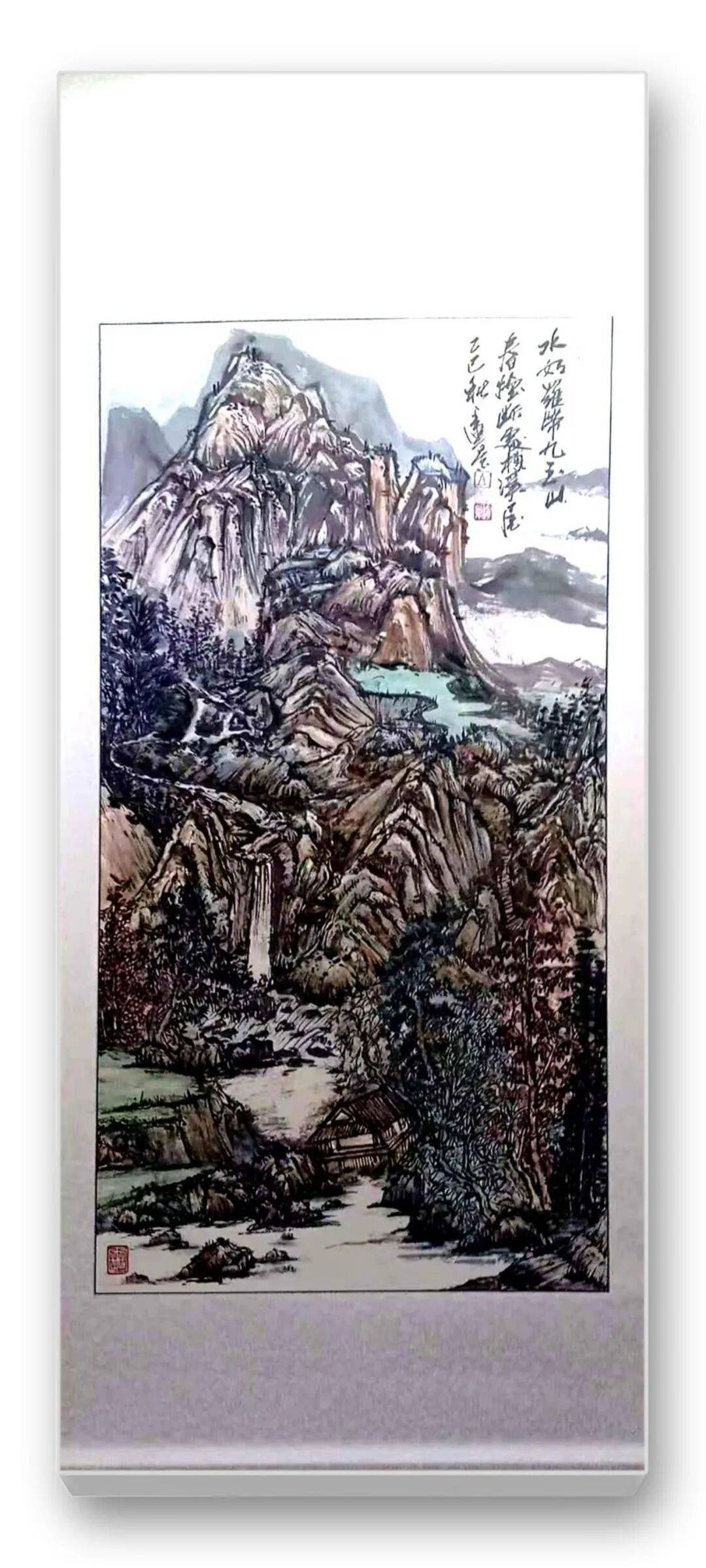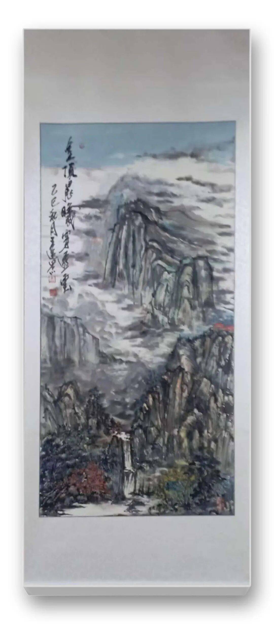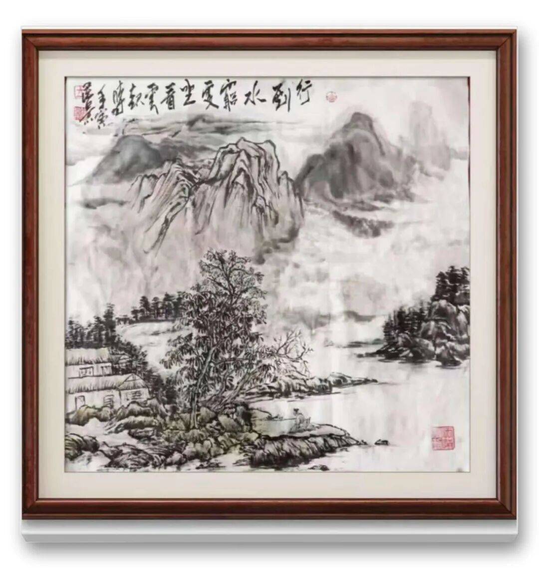 如果说王运景老师的写意花鸟以灵动鲜活见长,那么他的山水画则以“雄浑壮阔、意境悠远”彰显特色,展现出对自然山水的深刻感悟与对精神家园的执着追寻。他的山水画作品多以名山大川为创作原型,却并非简单的写实复刻,而是通过对山水形态的提炼与重构,营造出兼具自然之美与精神之境的艺术画面。在构图上,他善于运用“高远、平远、深远”的传统构图法则,使画面层次丰富,空间感十足。其太行雄姿便是典型代表,画面以高远构图展现太行山的雄浑壮阔,远处山峰连绵起伏,以淡墨渲染,朦胧缥缈,尽显山峦的悠远深邃;中景山石嶙峋,以浓墨重笔勾勒轮廓,辅以斧劈皴、披麻皴等传统皴法,展现出山石的坚硬质感与厚重形态;近景点缀几株苍劲的松树与古朴的村落,为画面增添了人文气息与生活韵味。整幅作品笔墨厚重,色彩沉稳,既展现了太行山的雄奇险峻,又传递出一种雄浑壮阔、大气磅礴的精神气象,让观者在欣赏画面的同时,感受到大自然的震撼与力量。