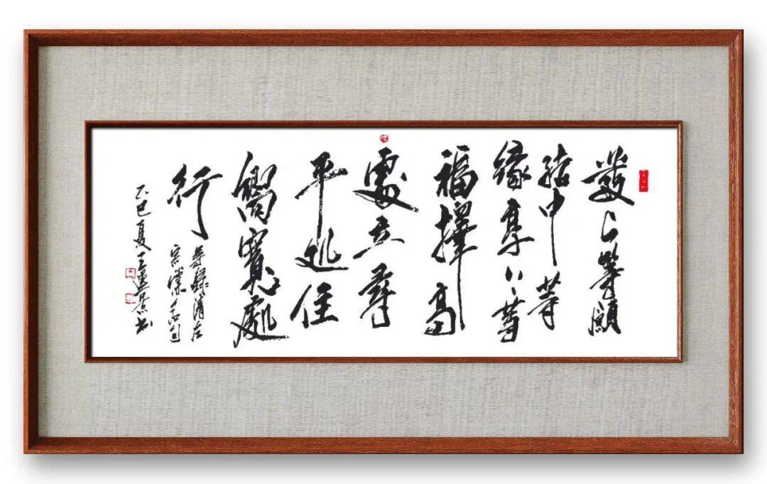 笔墨随心,是王运景先生书法作品的核心特色。书法之妙,在于笔墨的精妙掌控与情感的自然流露。先生深谙“笔墨不分家”之道,将“笔里有墨、墨里有笔”的创作理念融入每一幅作品之中。其用笔深谙提按顿挫之理,导之则如泉注奔涌,顿之则如山安沉稳,线条或纤细如新月出天涯,或浑厚似虬龙蜿蜒,粗细变化错落有致,节奏韵律恰到好处。在墨法运用上,先生更显匠心,清墨挥洒处,字迹空灵剔透;浓墨重彩时,层次丰富厚重,燥润相生间营造出多变的视觉意境,将书法艺术“墨分五色”的魅力诠释得淋漓尽致。尤为值得称道的是其草书作品,线条如流泉飞瀑,笔势似惊电奔雷,上下翻飞间尽显动态之美,左蹙右盼中暗藏呼应之妙,堪称“力透纸背的千钧力道,因气蓄势的千变万化”。