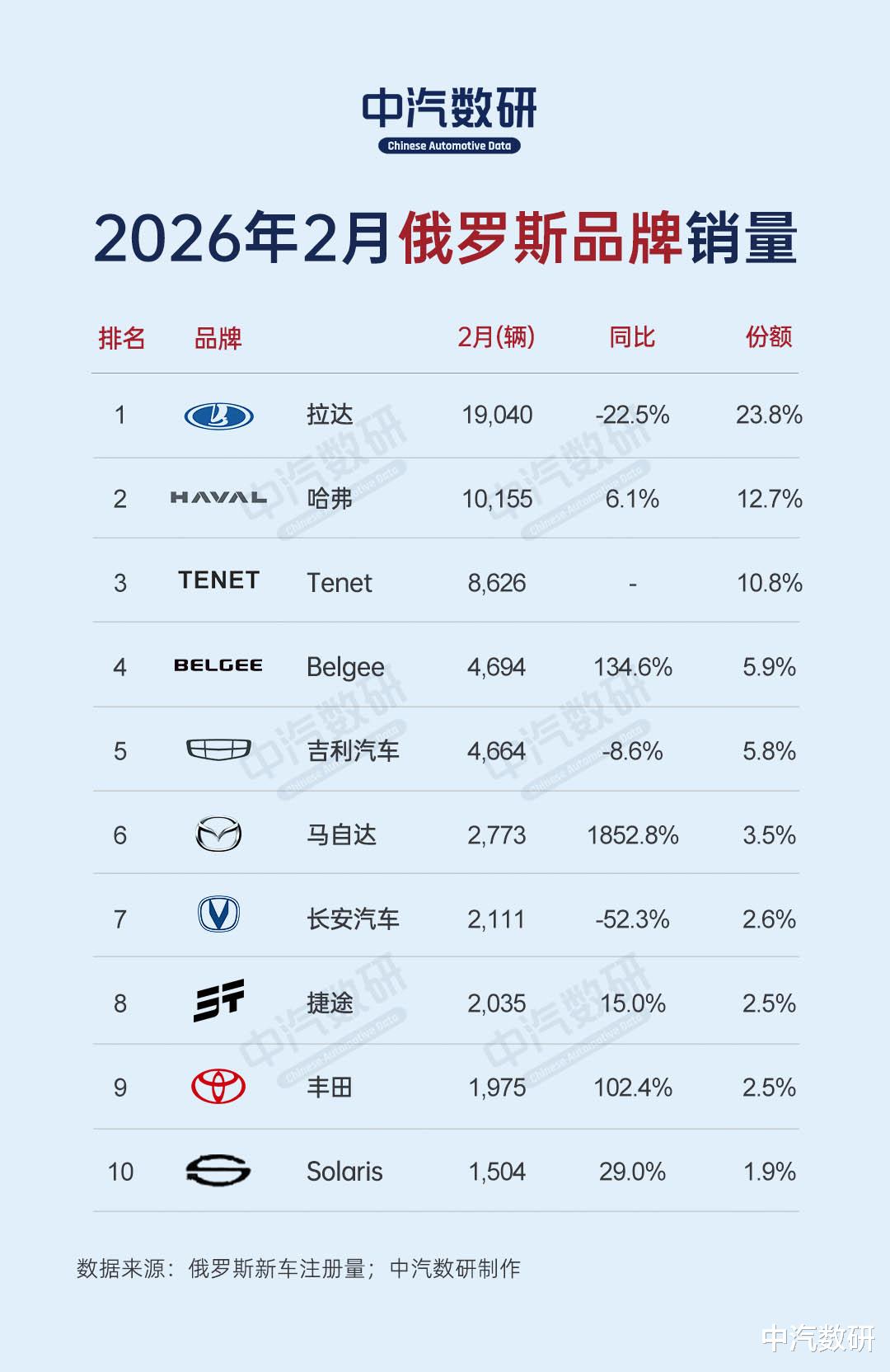 Autostat机构发布的数据显示,2026年2月俄罗斯新乘用车销量为80,027辆,同比增长2.5%。