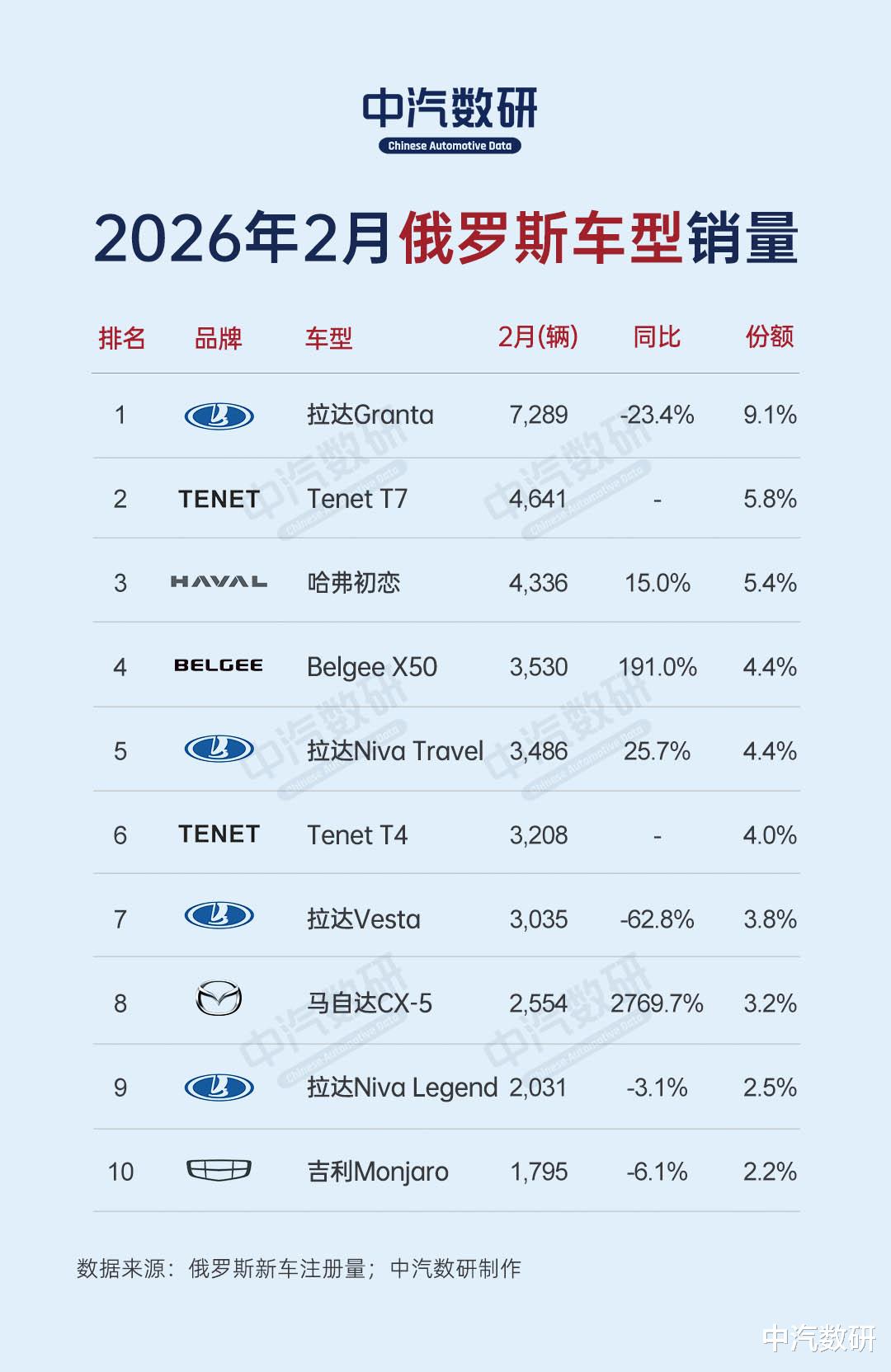 Tenet作为奇瑞换标品牌,2月份销量8,626辆,市场份额10.8%,拿下品牌榜第三。旗下主力车型Tenet T7(换标版奇瑞Tiggo 7L)销量4,641辆,跃居车型榜第二,市场份额5.8%,成为俄罗斯市场的新势力代表。