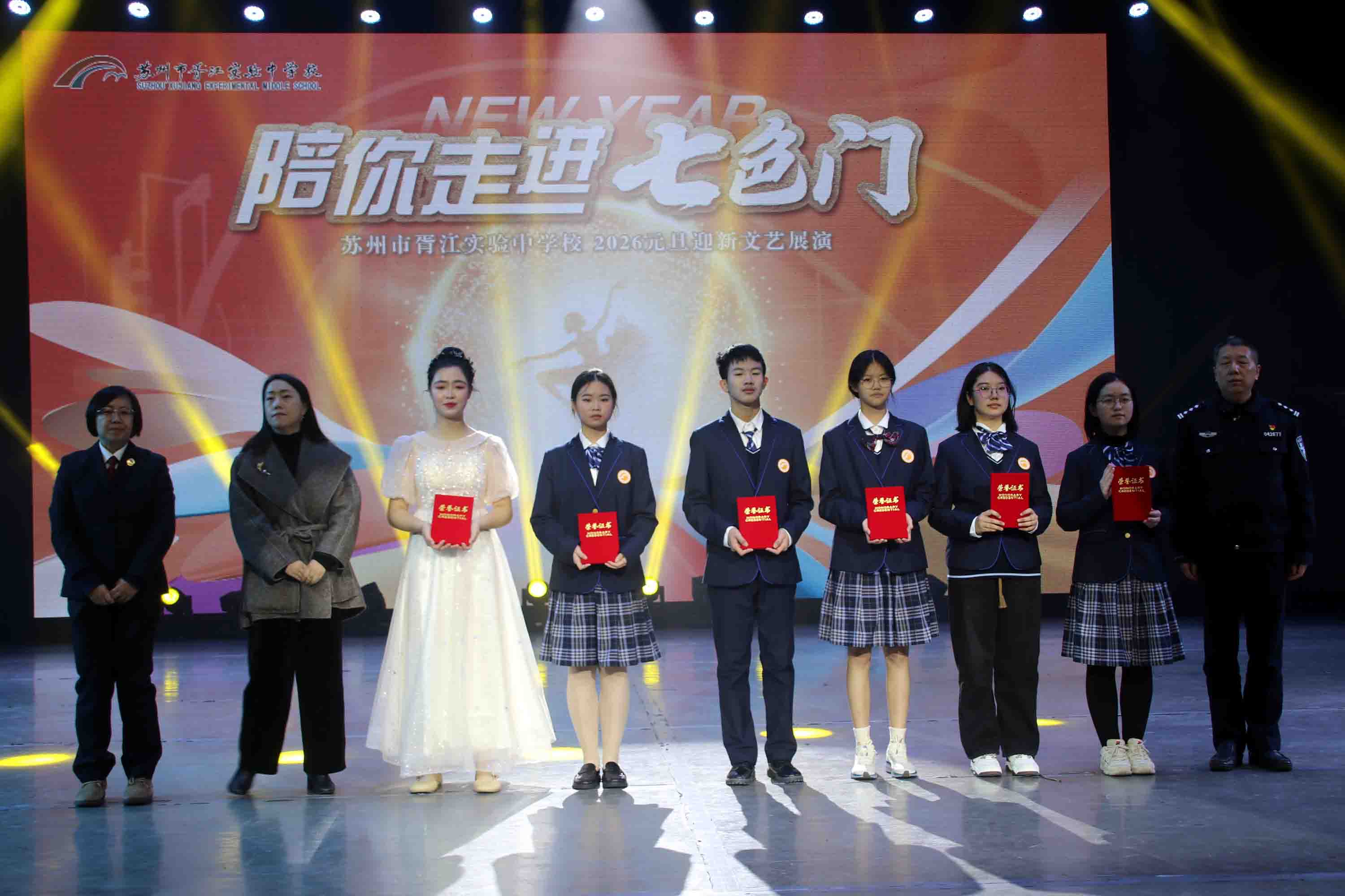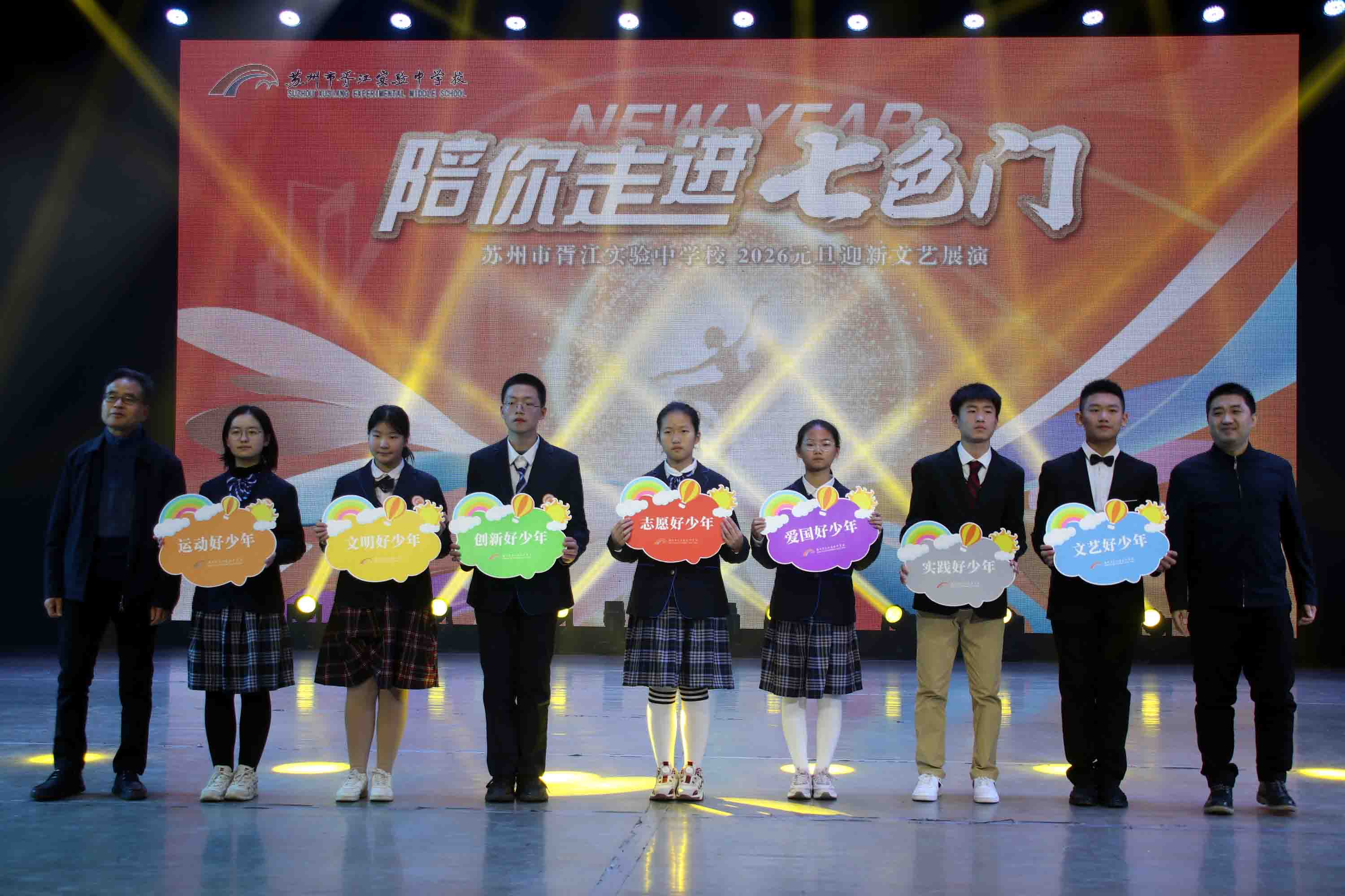 现场不仅有精彩的文艺演绎,更有多项育人成果落地的重要时刻,心理健康教育指导中心揭牌仪式温馨举行,将为学子们搭建三级防护网络与五维育人融合的成长支撑;“纹以载道——跨学科协同文物创生营”项目启动仪式同步举行,为传统文化创新性发展注入青春活力;法治文化长廊揭牌仪式则进一步夯实育人根基。此外,“清源小院士”“清源奋劲奖”“七彩好少年”等多项奖项的颁发,既表彰了在科创、体育、品德等不同领域表现突出的学子,更践行了“让每一个孩子都有闪光时刻”的育人承诺。 欢歌迎新年,逐梦新征程。此次2026元旦迎新文艺展演,不仅为师生们带来了一场视听盛宴,更以艺术为桥、以成长为核,全面展现了苏州市胥江实验中学在多元化培养道路上的坚定步伐与显著成效。新的一年,胥江实验中学将继续秉持育人初心,深耕多元培养沃土,让每一片“叶子”都能在阳光雨露中成长为独特的“花朵”,为学子们的未来发展奠定坚实基础,书写更加辉煌的教育篇章。 (渝芳)