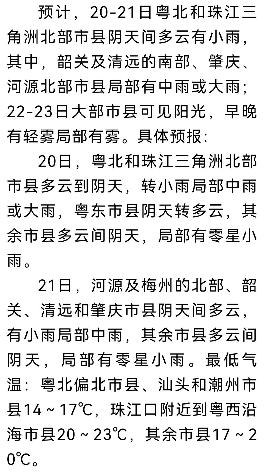 韶关及清远的南部、肇庆、河源北部市县局部有中雨或大雨
