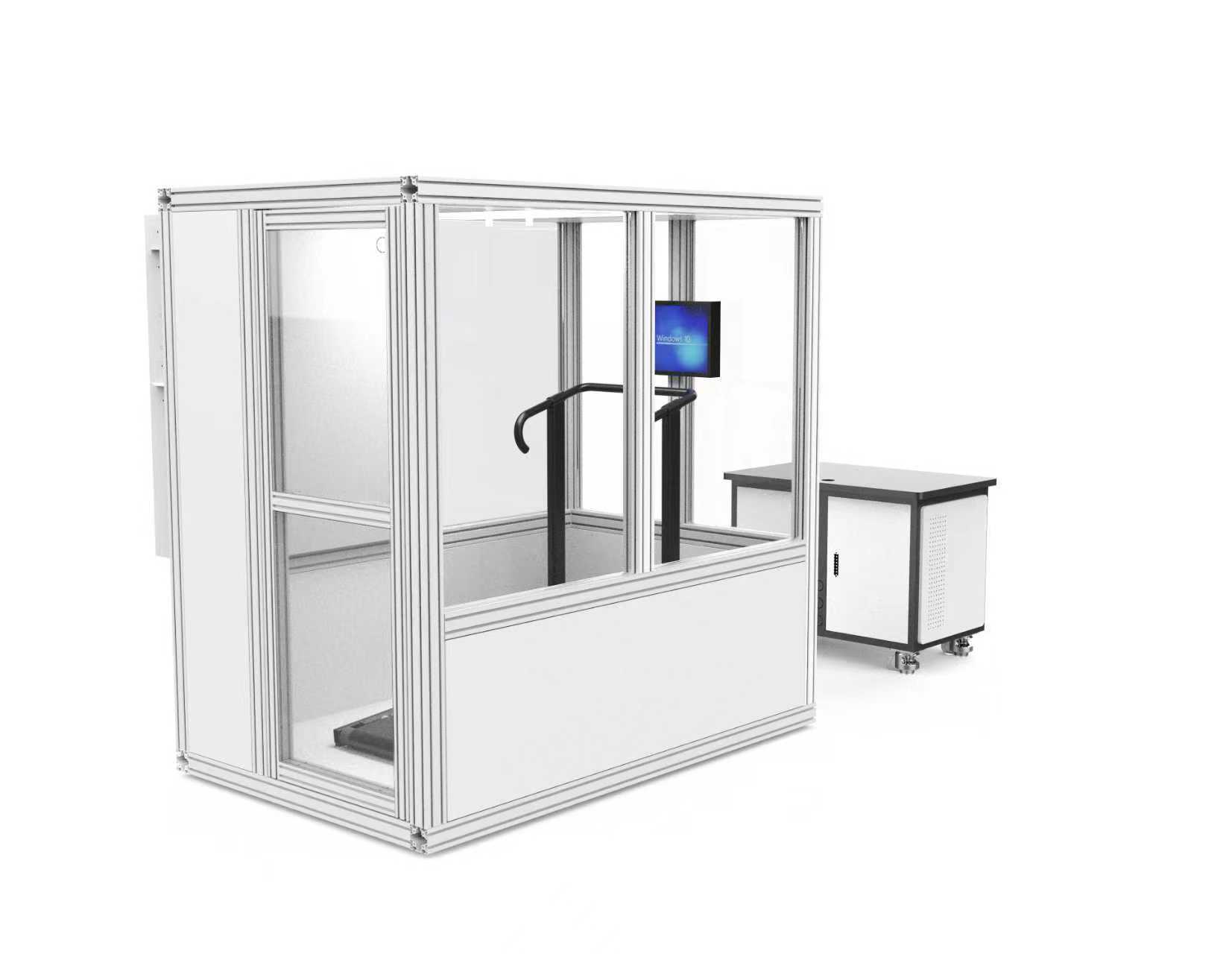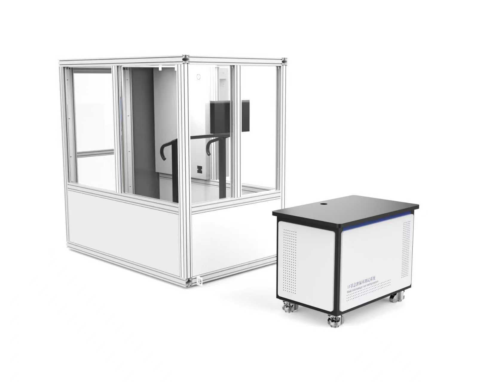 6、口罩总泄漏率测试装置检测仓:尺寸:长度:≥200cm;宽度:≥130cm;高度:≥215cm;测试无横向气流干扰时的受试者头部上方30cm处风速:≤0.2m/s;测试横向气流时的受试者头部位置处风速约为2m/s(需来自受试者前方、后方和侧方(左侧或右侧)3个方向);全不锈钢框架,真空钢化玻璃材质;仓内设置有可视化操控系统,可以与工作站控制软件同步;