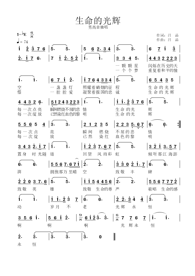 红色正能量大型主题歌曲《生命的光辉》歌曲词谱赏析: