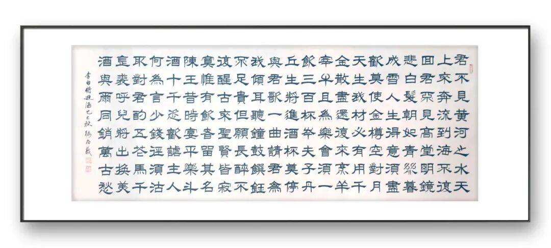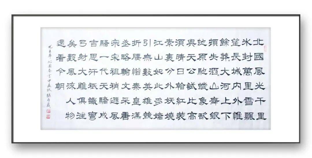 但徐存义先生的隶书可贵之处,更在于"不泥古"的创新精神。在结体字势上,他打破了汉隶单一的形态局限,字体时而富于上挑之势,时而又呈扁平之形,变化丰富而妙趣横生。章法布局上,他更是匠心独运,字字如"夫之阵者",左右横展而规矩严整,上下映照而布列均衡,在严整中求变化,在变化中守秩序。他将《礼器碑》的奇险、《史晨碑》的端庄与自身对书法的理解相融合,借助笔墨的浓淡枯润、线条的粗细强弱,赋予隶书新的视觉张力与情感表达。