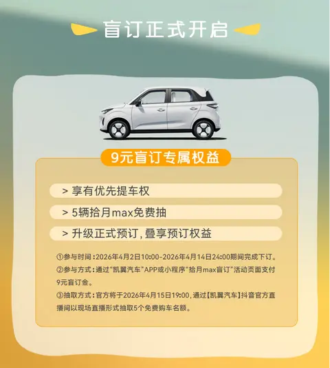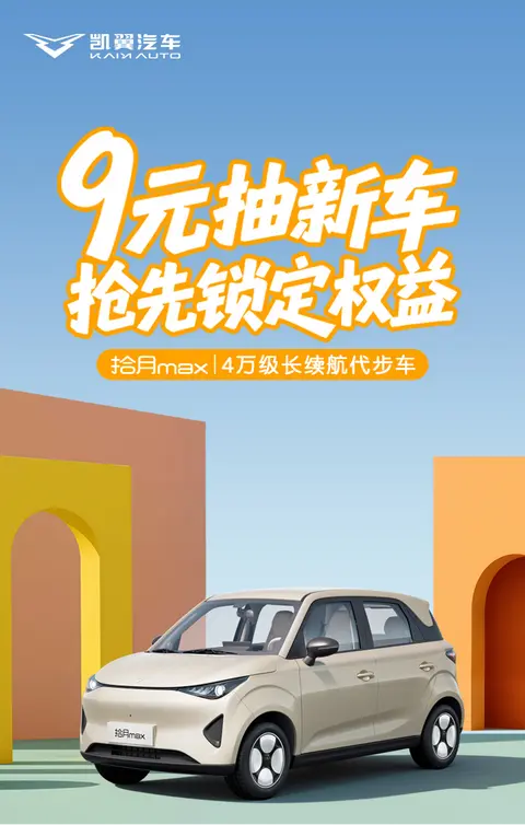 2.参与通道:打开「凯翼汽车」APP / 小程序,找到「拾月 max 盲订」活动页,支付9元盲订金(盲订金随时可退),成功锁定所有福利;