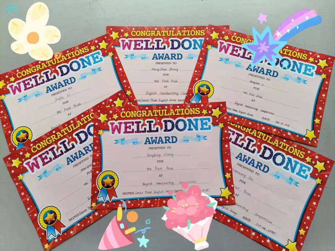 为确保评审的专业性与公正性,英语组教师组成专项评审团,制定了“内容立意、语言表达、书写规范”三维度评审标准。评审老师们细致审阅每一份作品,既关注书写的基本功,更看重内容对“成长”“成人”主题的诠释深度。经过多轮筛选,最终评选出一等奖6名、二等奖12名、三等奖18名。