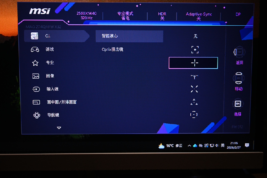 面板素质方面,微星MAG 274QRFW X32白刃搭载27英寸2K分辨率Rapid IPS快速液晶面板,对咱们普通玩家来说,Rapid IPS面板比普通IPS响应更快,玩FPS游戏画面拖影更少。亮度与色彩表现方面,产品峰值亮度可达400nit,官方标称覆盖97%DCI-P3、95%AdobeRGB及129%sRGB色域。