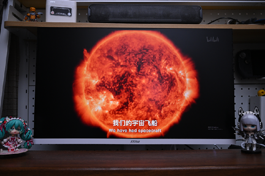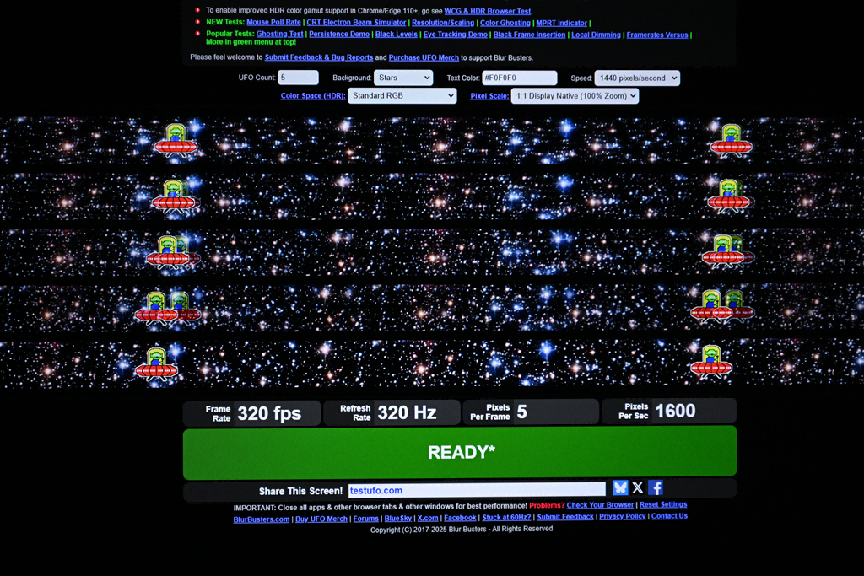 将显示器回归默认设置,使用1/1000速快门拍下UFO测试,320Hz刷新率飞碟的重影并不明显,重影小且边缘干净,说明显示器的过驱动功能调校得当,在加速像素响应的同时,没有产生过度补偿的伪影,达到了响应速度与画面纯净度的最佳平衡。