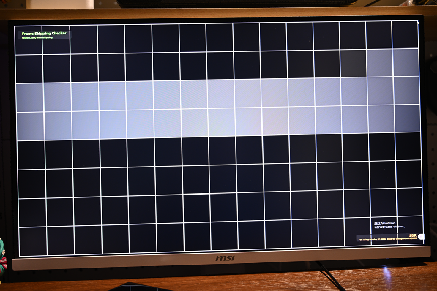 接下来使用1/10快门测试For Display Overclocking项目,拍下后数出方块数为32,计算原理为显示器每秒320帧刷新率,1/10秒时间内会在白格上留下32格光源残留,说明了显示器320Hz并未采用跳帧等作弊手法,为真实刷新率。