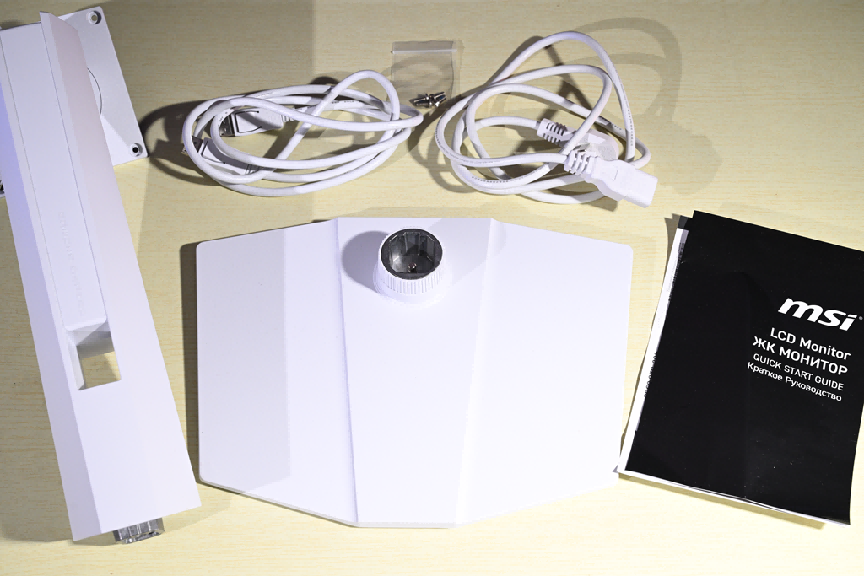 开箱后内部配件从左到右分别为显示器支架、DP1.4信号线、220V电饭煲线、显示器底座、保险卡&说明书。