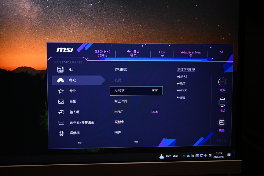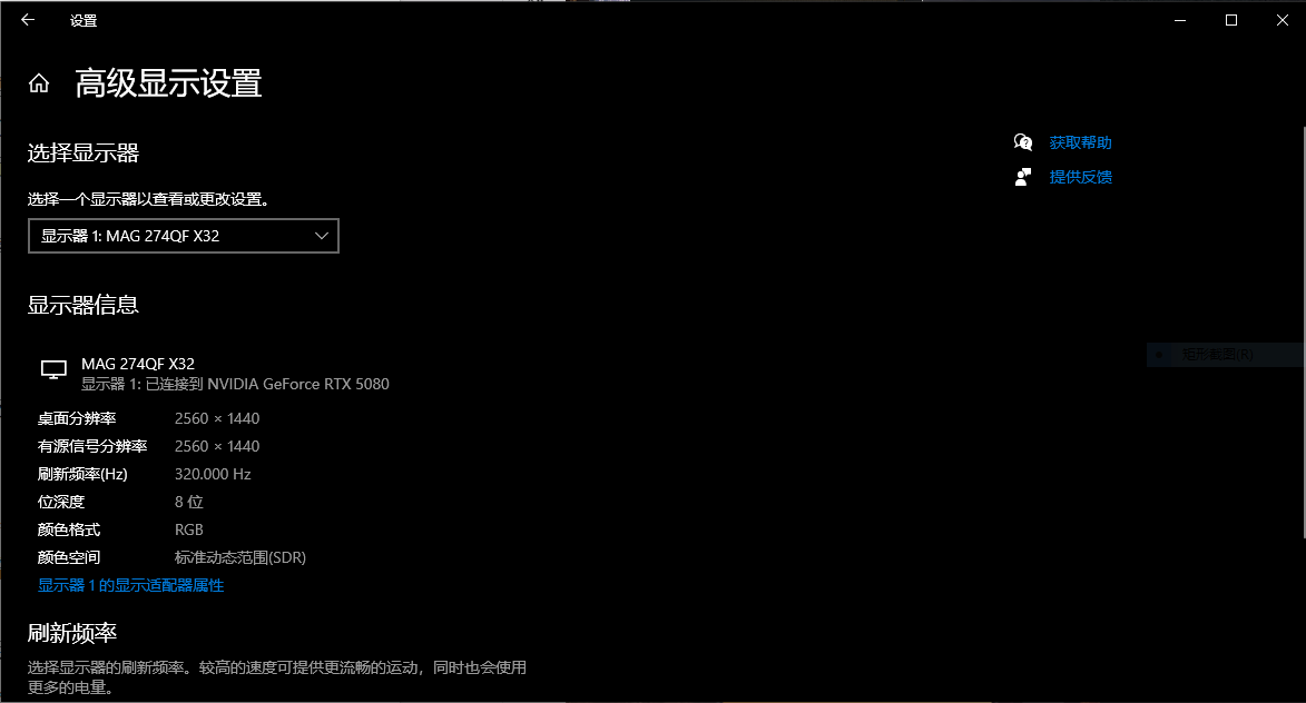 需要说明的是,开启2K320Hz刷新率需要至少Win 20H2系统支持、并在桌面右键---显示设置---高级显示设置中,将刷新率调整到320Hz。