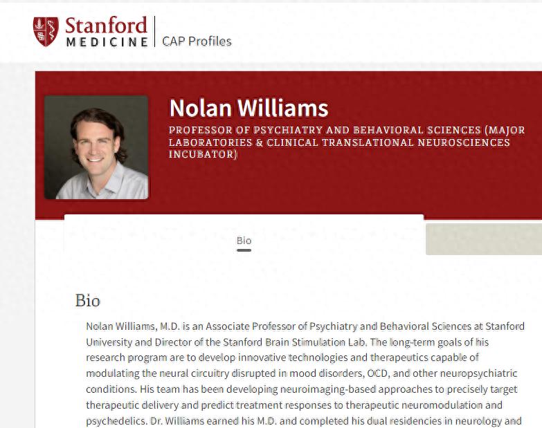 威廉姆斯不是普通的研究者。他是斯坦福脑刺激实验室的主任,介入精神病学临床研究的领军人物,被誉为“精神病学界的耀眼明星”。他研发的“斯坦福加速智能神经调节疗法”,是世界上首个针对难治性抑郁症的非侵入性快速疗法,甚至获得了美国FDA的突破性设备认证。他曾公开说:“我的期望,是在有生之年彻底改变精神疾病的治疗格局。”