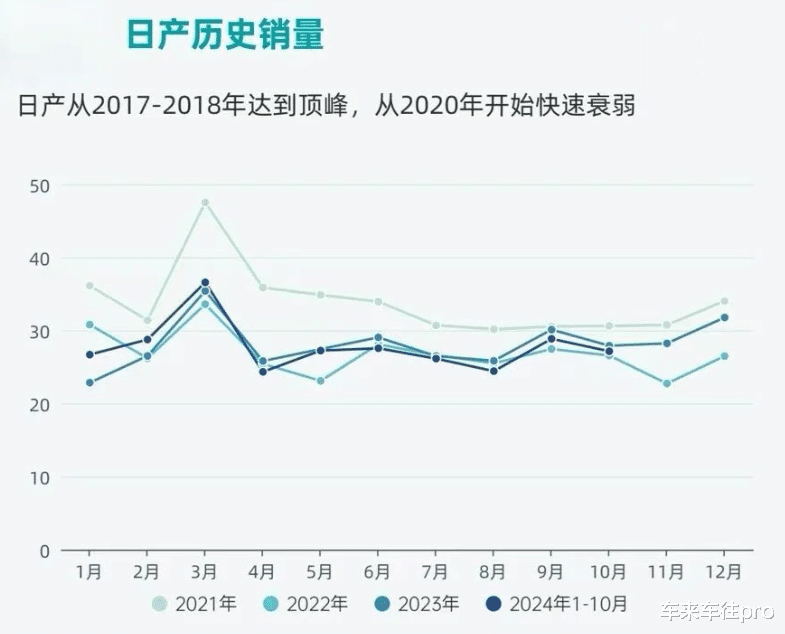 日产曾经在中国市场躺赢,销量巅峰时期一年卖 150 多万辆。但 2024 年销量只有 69.7 万。